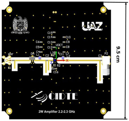 An RF front-end of a CubeSat communication subsystem is an essential functional element and has two critical parts for transmission and reception chains, that is, amplification and filtering stages. Most satellite applications work at frequencies above 1 GHz; for example, for space research in Mexico, the frequency band from 2.2 to 2.3 GHz (S-band range) is assigned []. Specialized substrates are necessary to design and fabricate high-frequency power amplifiers on a printed circuit board (PCB). Substrates such as RO4350b, CuClad 250, RT/duroid 5880, RO4003C, RO3003, and TC350 meet requirements such as permittivity and loss tangent. Substrate properties define the width and length of the microstrip lines, which are the basis of traditional distributed microwave components and circuits. These properties limit the usage of any substrate characteristic because of CubeSat dimension limits. At the amplification stage, the maximum design limitation are the input and output matching ports, which force the optimization of the substrate properties to obtain the desired dimensions [,,]. According to the method used in [] for the downlink budget (from CubeSat to earth station), for an LEO at 600 Km, a transmission output power of 33 dBm is enough to receive telemetry information, even an image at the ground station.