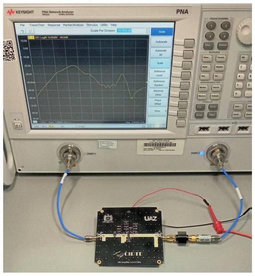 Attenuators are required at the output of the amplifier to protect the equipment from damage due to overload. A 5 V power supply biased the amplifiers. In this case, only transmission parameters were used to determine the gain and power characteristics, previously considered the attenuators’ effects in the calibration process.
