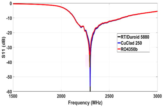 Input reflection parameter (S11) simulation for the selected RF substrates centered at 2.25 GHz.