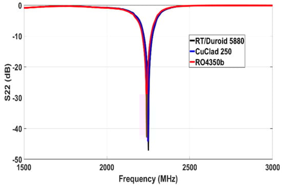 Output reflection parameter (S22) simulation for the selected RF substrates centered at 2.25 GHz.
