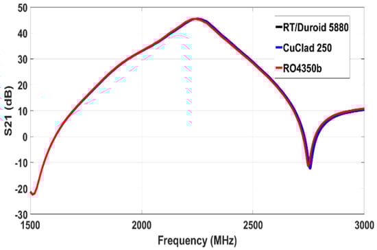 Forward transmission parameter (S21) simulation for the selected RF substrates centered at 2.25 GHz.