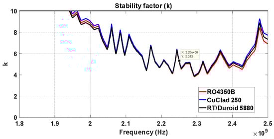 Stability factor (k) simulation for the selected RF substrates at 2.25 GHz.