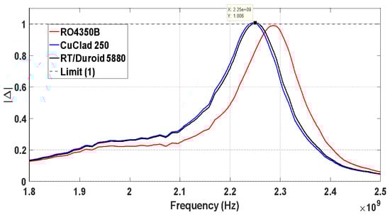 Stability measure (|Δ|) simulation for the selected RF substrates at 2.25 GHz.