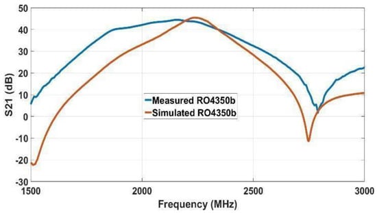 Small-signal transmission characteristics of the simulated and measured results for a RO4350B substrate centered at 2.25 GHz.