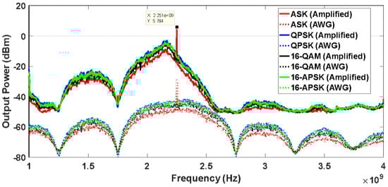 An arbitrary waveform generator (AWG), M8190A, from Keysight was configured to introduce typical satellite modulated signals to the signal conditioning chain and evaluate the performance against possible real applications. The injected modulated signals were amplitude-shift keying (ASK), quadrature phase shift keying (QPSK), quadrature amplitude modulation (16-QAM), and amplitude and phase-shift keying (16-APSK). All modulated signals worked at a carrier frequency of 2.25 GHz and a symbol rate of 500 Mbaud. An essential parameter for amplifiers is the power-added efficiency (PAE), and it is set as high as possible for satellite applications. For that, a 2.25 GHz sinusoidal wave from −21 to −4.8 dBm was applied to the device under test (DUT) input, and then we observed the output power (POUT) through a signal analyzer. Therefore, for each power value, the PAE was calculated as