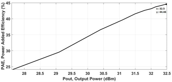 Finally, in Figure 14, a plot of PAE vs. POUT is shown. It is worth mentioning that PAE increases as the signal conditioning stage becomes saturated. In this case, the signal conditioning chain reaches 45% at its maximum output power of 33 dBm.