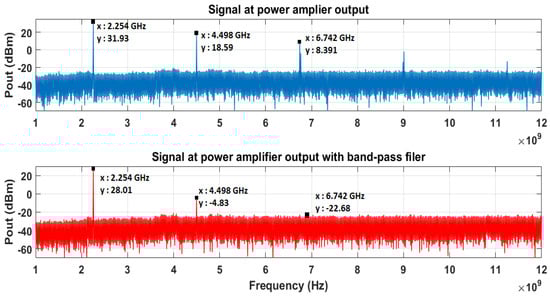 Figure 15 shows a comparison of signal at the power amplifier output without a band-pass filter in blue and with filter in red. It shows how the filter performs harmonic suppression, but it affects output power, decreasing it up to 4 dB.