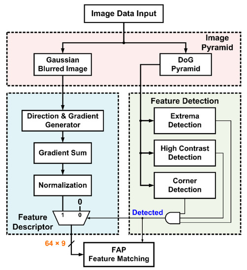 Once the results of the three detections are all positive, the detection point becomes a feature point, and a detected signal will be sent to the feature descriptor and feature matching blocks for further processing.