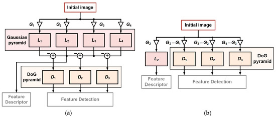 where Ln(x, y) and Gn(x, y) are the nth level Gaussian-blurred image and Gaussian kernel, respectively, and I(x, y) is the initial image. In the proposed structure, the DoG pyramid and the required Gaussian-blurred image can be directly created at the same time. Here, only the 2nd level Gaussian-blurred image is reserved to be the basis of the feature descriptor.