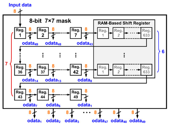 Since a 7 × 7 mask is adopted mainly for the convolution in the image pyramid, 49 general-purpose 8-bit registers will be required to store the pixel data. For an image width of 640 pixels, a large number of 8-bit registers needs be aligned row by row for the serial input of pixel data. To dramatically reduce the number of internal registers, we propose a buffer structure as shown in Figure 3. We utilize Altera optimized RAM-based shift registers to form a six-row buffer array, where each row includes 633 registers. Once the pixel data reaches the last one, i.e., reg. 49, the 7 × 7 convolution can be accomplished in one clock cycle. A similar buffer structure with different sizes for the following building blocks requiring a mask can also be adopted to efficiently reduce the register number as well as shorten the buffer delay.