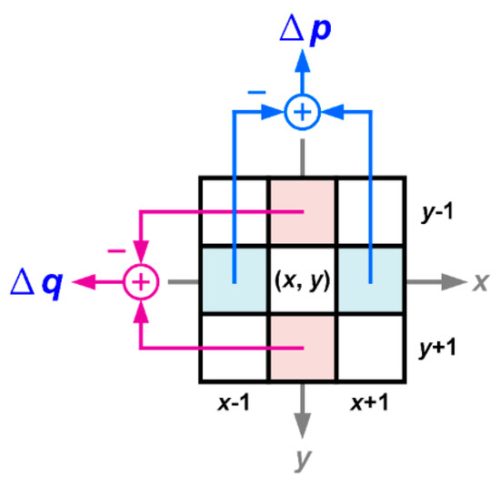In conventional approaches, the center point, i.e., L2(x, y), of every 3 × 3 mask shifting in the 2nd level Gaussian-blurred image is the detection point. The variations of the detection point on x and y axes, i.e., Δp and Δq, are defined by the differences between two adjacent pixel values, as shown in Figure 5.