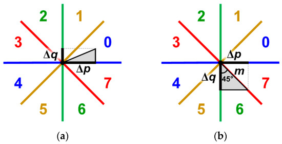 Conventional approaches generally utilize the CORDIC algorithm to derive the results of Equations (4) and (5) [17]. However, time-consuming and tedious procedures would ensue due to a large number of iterations. In this paper, we propose a simple TI method to determine the phase of detection points. Since only eight directions exist in the original definition, the direction of the detection point can be easily determined by the value of Δp and Δq, which are two legs of a right-angled triangle. For example, if Δp is larger than Δq, and both are greater than zero, then the hypotenuse will be located in direction 0, as shown in Figure 6a. Thus, the direction of the detection point is classified as phase 0 directly. Conversely, the direction of the detection point is classified as phase 1 if Δp is smaller than Δq. In a similar way, we can easily recognize other different directions by using Table 1. The required conditions are also devised to distinguish different directions. Absolute values are considered in reality because the lengths of both legs cannot be negative.