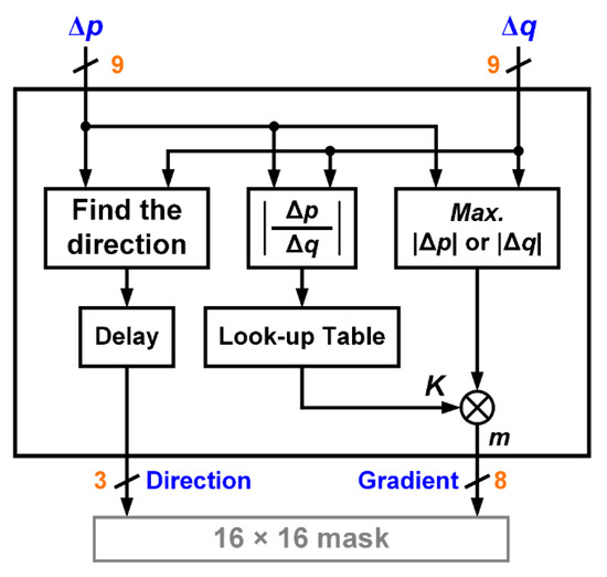 To accelerate the generating speed of feature descriptors, the direction and gradient of the detection point need to be quickly determined. Thus, in this paper, the TI method is proposed to promptly determine the direction of the detection point. Combined with a look-up table, the gradient of the detection point can be easily estimated. In general, eight different directions need to be determined to reduce the complexity of the phase of the detection point [9,16]. In this paper, the eight directions with unsigned gradients for the detection point have been simplified to four with signed ones to reduce the hardware cost. Although the resulting gradient size increases by one bit, the dimension of the feature descriptor can be effectively reduced by half. It is also helpful to the FAP feature matching for implementation.