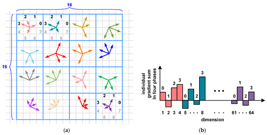 (a) Sixteen 4 × 4 partitions in a 16 × 16 mask for the feature descriptor and (b) the corresponding gradient sum in each 4 × 4 partitions.