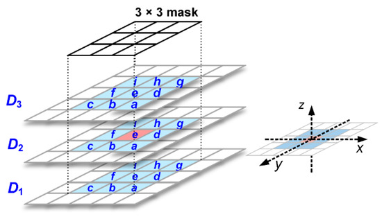The detection range includes 27 pixels in three DoG images under a 3 × 3 mask, where the orange pixel is regarded as the detection point.
