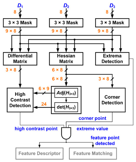 In the beginning, we use three levels of DoG images to establish a 3D space. A 3 × 3 mask will then be applied to the three DoG images to define 27-pixel data for feature detection, as shown in Figure 10. Thus, center pixel of the 3 × 3 mask in the 2nd level DoG image, D2, is regarded as the detection point. Three kinds of detections, including extrema detection, high contrast detection, and corner detection, are adopted and processed in parallel, as shown in Figure 11.