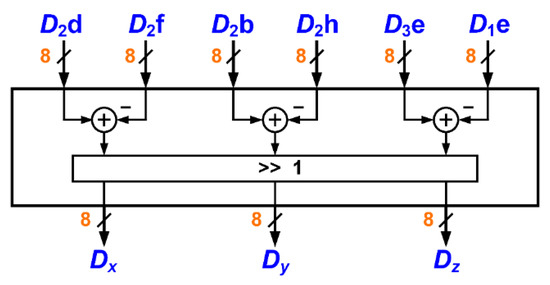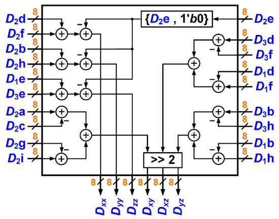 Since both the matrices are symmetric, only six elements need to be determined. Figure 12 shows the realized structure, where pixel inputs come from the corresponding positions shown in Figure 10.