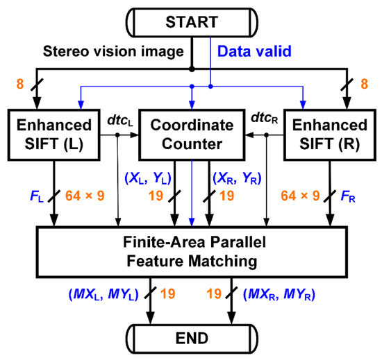 A double E-SIFT with FAP feature matching system is proposed for use in stereo vision, as shown in Figure 16. The stereo vision captures images by parallel cameras for the left and right E-SIFTs respectively to find the feature points and the corresponding feature descriptors, FL and FR. At the same moment, the corresponding coordinates will be output by a counter triggered by the detected signals, dtcL and dtcR, from the two E-SIFTs. Then, the stereo matching points, MXL, MYL, MXR, and MYR, will be found out and recorded by the proposed FAP feature matching. Since the image transmission could be interrupted due to the finite bandwidth of SDRAM or noise coupling, a data valid signal is added to alarm all building blocks to prevent abnormal termination or any discontinuous situation from corrupting correct output messages.