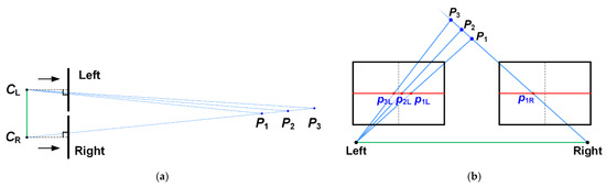Suppose two cameras, CL and CR, are set up in parallel at the same height without any tilt angle difference, and three objects, P1, P2, P3, are placed in line with the right camera, as shown in the top view in Figure 17a [20]. In theory, the projections of the same object onto two image planes will be on the same row. However, based on Epipolar geometry [15], the imaging of P2 and P3 in the right image could disappear due to the shading effect caused by P1. As shown in Figure 17b, three imagings, P1L, P2L, and P3L, appear in the left image, but only one projection, P1R, in the right one. Therefore, to avoid the feature points of the left and right images from error matching, a minimum threshold value for comparison will be chosen in the proposed FAP feature matching.