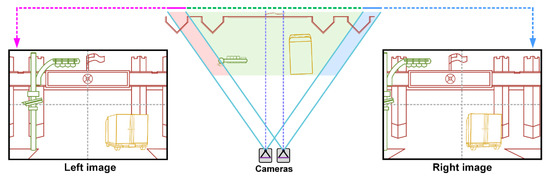 Different scenes are captured in stereo vision due to the visual angle difference between two cameras.