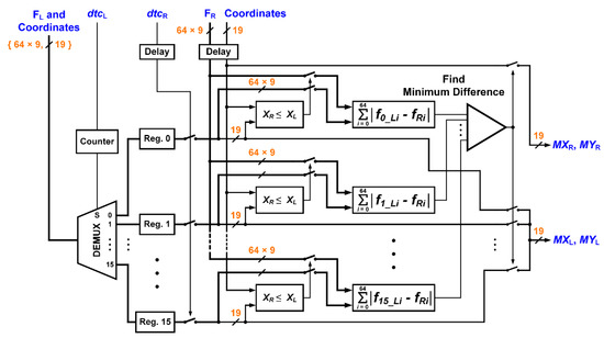 Figure 19 shows the building blocks of the proposed FAP feature matching. A demultiplexer transfers the serial feature point data into a parallel form by the left detected signal, dtcL. The feature descriptors and the corresponding coordinates will be stored into registers. Then, sixteen feature points data of the left image will be compared with the feature point of the right image simultaneously when the right detected signal, dtcR, is received.