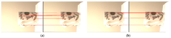 To test the flexibility of the proposed E-SIFT, outdoor and indoor images are also skewed for feature matching with the original one, as shown in Figure 23a,b, respectively, where the matching accuracy reaches 88.89% and 92.39%, respectively, for these two images. The experimental results have shown that the proposed E-SIFT exhibits good performance even for images having cluttering scenery.