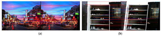 When stereo images 00 02566.png from KITTI dataset having a car in the street are applied respectively to the left and right E-SIFTs, more feature points, i.e., 2162 and 1972 in the left and right images, can be detected, as shown in Figure 26b. Note that there are 102 and 110 feature points around the car in the left and right images, respectively. After the FAP feature matching, we obtain 560 matching pairs where 44 are for the car. Both the above-mentioned experiments of stereo visions present sufficient matching points for the purpose of mapping or object tracking. To evaluate the accuracy of the proposed double E-SIFT with FAP feature matching, the stereo images are aligned vertically, where green matching lines are depicted with the same procedure, as shown in Figure 27a,b. The accuracy of the proposed double E-SIFT with FAP feature matching presents good results because there are no apparent skewed matching lines existed in the images.