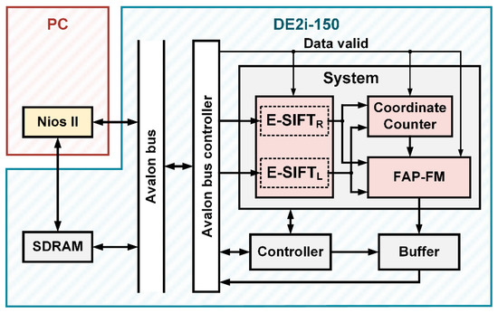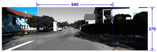 In this paper, a stereo vison architecture of double E-SIFT integrated with FAP feature matching is proposed, as shown in Figure 24, where stereo images from the KITTI dataset are firstly written into SDRAM of Altera DE2i-150 by Nios II. When the system is activated, the stereo images in the SDRAM will be delivered to the proposed stereo vision system through the Avalon bus. An end signal and coordinates of the matching pairs will be sent back to a PC through buffers after finding the feature points. In the following experiments, we use 1226 × 370 images from the KITTI dataset for the proposed double E-SIFT and FAP feature matching system [24]. To be able to compare with other published papers, the KITTI stereo images are tailored symmetrically with respect to the center to form an image having 640 × 370 pixels, as shown in Figure 25.