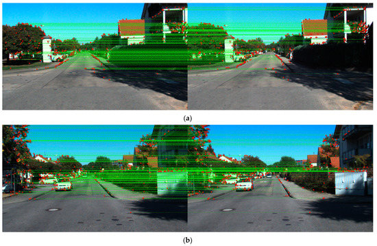 (a) Stereo vision images, 05 000000.png from KITTI dataset, are applied to the proposed double E-SIFT with FAP feature matching, resulting in 497 matching pairs between the left and right images; (b) Stereo vision images, 00 02566.png from KITTI dataset, are applied to the proposed double E-SIFT with FAP feature matching, resulting in 560 matching pairs between the left and right images.