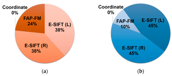 Table 5 shows the consumed hardware resources of the proposed double E-SIFT with FAP feature matching for stereo vision. The usage ratios of LEs, registers, RAM, and DSP/Multiplier in the DE2i-150 development board are 93.6%, 52.4%, 82.5%, and 8.9%, respectively. For the whole system, the double E-SIFT and the FAP feature matching occupy 76% and 24% of LEs, respectively, as shown in Figure 28a. Most of the registers, about 90%, are used by the E-SIFTs. Only 10% of the total register devices are used by the FAP feature matching, as shown in Figure 28b. The usage ratio of the coordinate counter is very low and can be neglected.