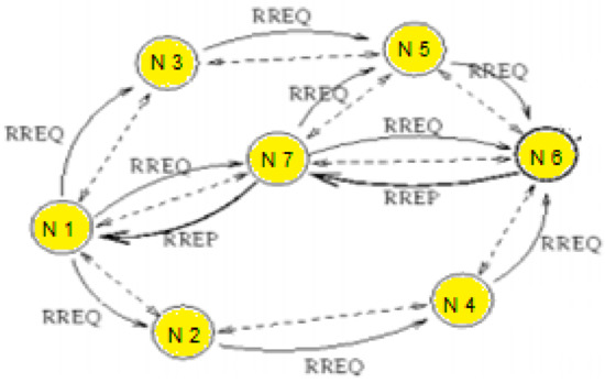 AODV follows a hop-to-hop routing methodology and belongs to the category of reactive protocols. In AODV, the node issues route requests (RREQs) if there is a requirement to identify the route for a specific target node. The transitional/intermediary nodes forward the RREQs; a reverse route is also generated for the target node [6]. When the target node gets the route to the destination request, it creates a route reply (RREP) that comprises multiple hops needed to reach the target, as shown in Figure 1.