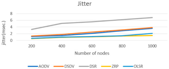 Figure 3, Figure 4, Figure 5, Figure 6 and Figure 7 show the performance analysis of the proposed outlier detection mechanism over five MANET routing protocols using various QoS parameters in a network of 200–1000 nodes. The QoS parameters taken for performance analysis were jitter, end-to-end delay, throughput, and sender and receiver energy consumption. The five MANET routing protocols selected for analysis were destination-sequenced distance vector (DSDV) routing, ad hoc on-demand distance vector (AODV), dynamic source routing (DSR), optimized link-state routing (OLSR), and the zone-based routing protocol (ZRP). The observations of QoS parameters were as follows: