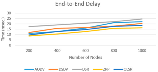 Figure 4 shows the comparative analysis of end-to-end delay in 200–1000-node networks using the proposed outlier detection mechanism over five MANET routing protocols. For end-to-end delay, the ZRP has the lowest value, while DSR has the highest value; with the rise in node numbers, the value of end-to-end delay rises; this is because of processing and propagation delays due to an increase in traffic that necessitates more processing time for the large number of requests received.