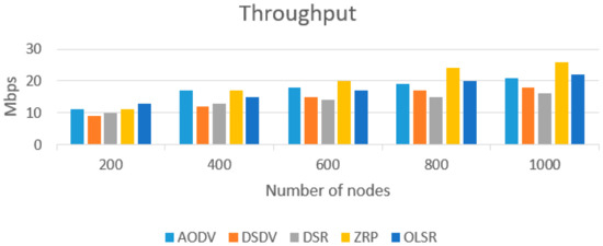 Figure 5 shows the comparative analysis of throughput in 200–1000-node network using the proposed outlier detection mechanism over five MANET routing protocols. With the rising number of nodes, throughput also increases; this is because there are several paths available to connect to the destination, and this, in turn, increases the probability of successful transmission. Among the five studied protocols, the ZRP breaks unidentified communication by creating different zones that become accustomed to dynamic settings in the network. Hence, the ZRP performs better in comparison to AODV, DSDV, DSR, and OLSR.
