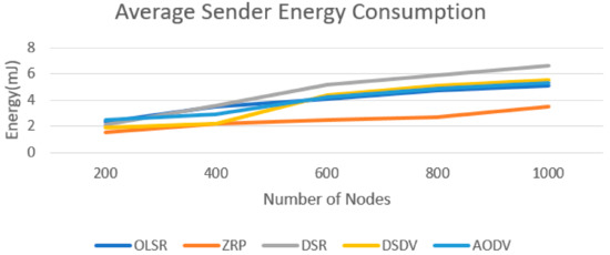 Figure 6 shows that average sender energy consumption is lowest for the ZRP and highest for the DSR protocol. This is because the ZRP makes a structured, connected, semi-hierarchical network that facilitates well-timed message delivery. In other protocols, the senders involved packet retransmission due to packet loss or discard in the unstructured network.