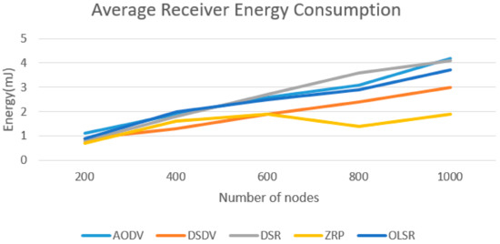 Figure 7 shows the comparative analysis of receiver energy consumption in 200–1000-node networks using the proposed outlier detection mechanism over five MANET routing protocols. The ZRP has the lowest value for average receiver consumption, as the network is structured—unlike other protocols, where it is unstructured. Unstructured networks have a higher probability of retransmission or loss of packet acknowledgment.