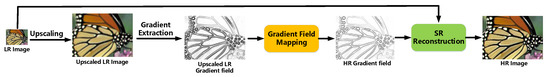 SR framework of the gradient-based methods is illustrated in Figure 2. The LR image is first upsampled to the high resolution using a simple interpolation method. This upsampled LR image usually contains visual artifacts due to the loss of high-frequency information. The lost image details such as edges and textures are mainly contained in image gradients. Therefore, the framework extracts the gradient field from and process it by a gradient recover operation, say :