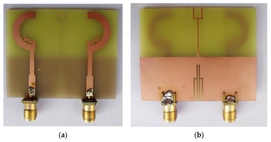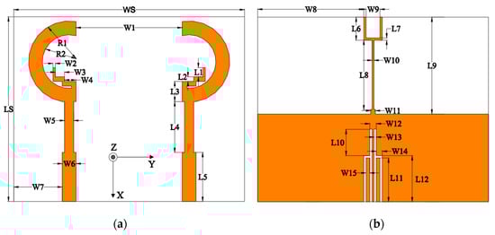 Figure 1 shows the geometry of the proposed dual-band MIMO antenna. The antenna was fabricated on a FR4 substrate with εr of 4.4, tan δ of 0.02 and a thickness of 1.59 mm. The proposed antenna radiation element consists of a pair of symmetrical semicircular annular microstrip lines and zigzag rectangular microstrip lines, which cleverly allocates higher and lower frequencies to different locations on the top view of the substrate. The feed lines with a width of 3 mm are used for better impedance matching. On the bottom view of the substrate, the methods of isolation are to etch two symmetrical h-shaped slots on the ground plane and to form a fork-shaped microstrip line.
