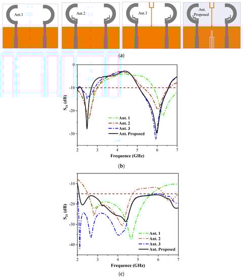 Evolution of the proposed antenna. (a) Structure of antenna 1, 2 and 3 and proposed; (b) simulated S11; (c) simulated S21.