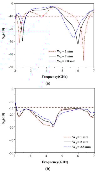 Simulated parameters with different values of W5. (a) Reflection coefficients; (b) isolation.