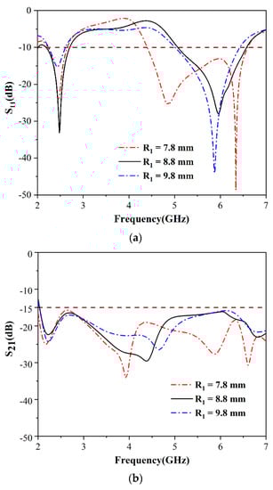 Adjusting the frequency of the higher-frequency band, as shown in Figure 4a, can be achieved by optimizing the value of R1, while the lower frequency band is unchanged. After optimization, the optimal size of the parameter R is 8.8 mm. The −10 dB impedance bandwidth can meet the requirements of band coverage. Figure 4b shows the isolation S21 is less than −15 dB at all required bands as well.
