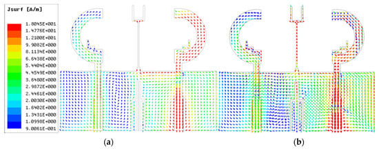 Simulated current distribution at two frequencies. (a) 2.4 GHz; (b) 5.5 GHz.