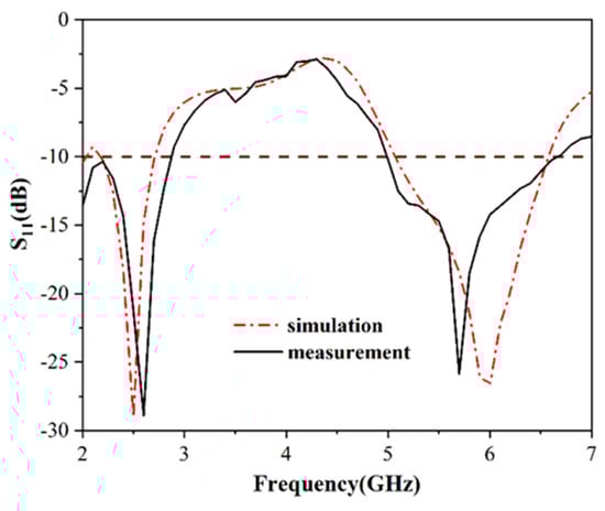 The S-parameters of the antenna port are measured by the PNA N5224A network analyzer. The measurement results are compared with the simulation results. Figure 7 shows the simulated and measured reflection coefficients S11 of the proposed antenna. The measured −10 dB impedance bandwidths are 680 MHz (2.12–2.8 GHz) and 1700 MHz (4.95–6.65 GHz) in the desired frequency bands, respectively. When the reflection coefficient of the port is tested, the measured results have a shift of the resonant frequencies compared with the simulation. The S11 is less than −10 dB, which meets the requirements in both bands of interest.