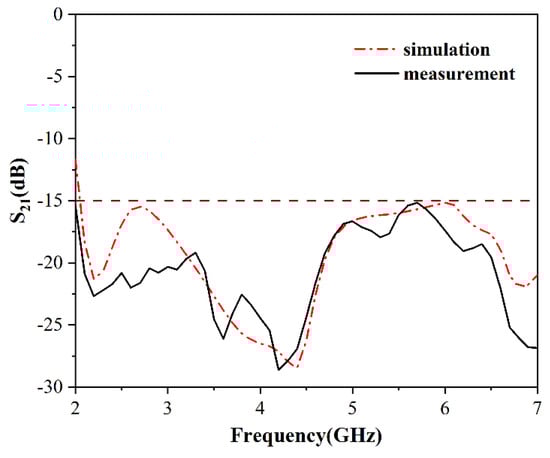As shown in Figure 8, the isolation of the antenna can be evaluated by S21. The measured S21 at the operating frequency bands (2.4–2.4835 GHz and 5.15–5.85 GHz) are less than −15 dB.