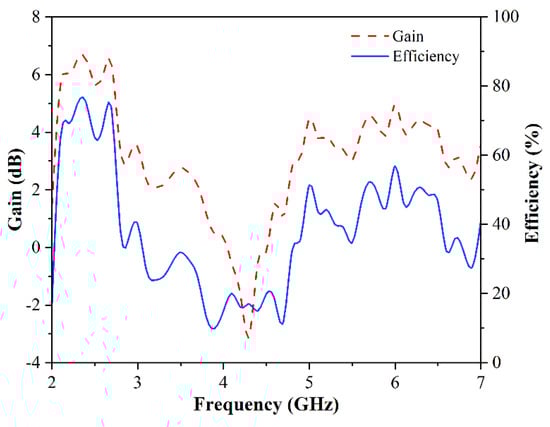 Figure 9 shows the measurement results of the peak gain and efficiency of the proposed antenna. It can be seen that the peak gain and radiation efficiency have the same trend. The measured peak gains are about 6.4 dBi and 4.8 dBi in the frequency band required, and the radiation efficiencies at this time are 68.26% (65.03~75%) and 51.36% (48.60~52.28%), respectively.