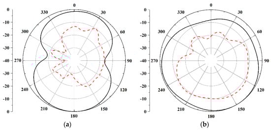 The proposed antenna test environment is carried out in a microwave anechoic chamber. Since the two antenna elements have the same structure and size, one port is excited, and the other port is connected by a 50 Ω load terminal. Figure 10 shows the normalized radiation polarization of the antenna operating at 2.4 GHz and 5.5 GHz. Co-polarization and cross-polarization are demonstrated by a black solid line and a red dashed line, respectively. It can be observed that the antenna presents a half-end fire radiation pattern on the E plane and a quasi-omnidirectional radiation pattern on the h plane. The welding effect of the SMA connector may cause the deterioration of the high-frequency radiation pattern.