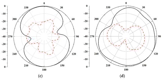 Radiation polarization of the proposed antenna. (a) 2.4 GHz E-plane; (b) 2.4 GHz H-plane; (c) 5.5 GHz E-plane; (d) 5.5 GHz H-plane.