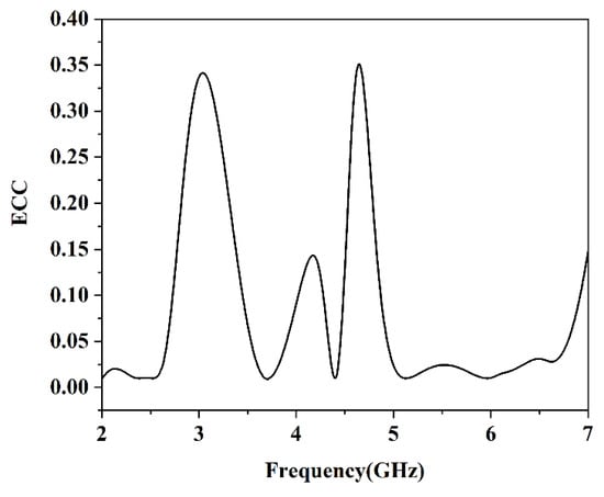 In general, an ECC value of less than 0.3 is within the limits [17,18]. For a wireless communication system, the lower envelope coefficient can obtain the larger channel capacity. Figure 11 shows the calculated ECC values of the fabricated antenna, which are smaller than 0.01 and 0.024 at 2.4 GHz and 5.5 GHz, respectively.