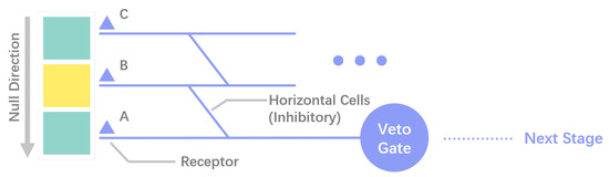 Barlow and Hill suggested that the neurons in the rabbit retina system exhibit direction selectivity and proposed two schemes of direction selectivity: An excitatory scheme and an inhibitory scheme. In this study, Barlow’s inhibitory scheme is discussed. Figure 1 shows the inhibitory scheme for direction detection in a null direction from up to down, which will reject the null stimulus by veto. In this case, the corresponding veto gate of A receives its photoreceptor input and a delayed inhibitory input from B. The photoreceptors A, B, and C, which are activated due to enhanced illumination in their corresponding region, might be the basic unit of human vision corresponding to one or a small pixel area (for example, 2 × 2 = 4 or 4 × 4 = 16 pixels) in an image. The spot of light traveling through the receptive field in the null direction will activate the receptor in the sequence C-B-A. The enhanced illumination-induced activity elicited in region B will pass the horizontal cells, which causes a delay. The response will reach the ’Veto Gate’ at the same time as the activity elicited in A and veto the response of A. Thus, the response from receptors will inhibit the next response in the null direction. However, if the spot of light travels in the preferred direction (A-B-C), the response of A will arrive at the veto gate before the inhibitory response of B. Similarly, A cannot veto the responses of B and C. Thus, each response will reach and activate the corresponding ’Veto Gate’ without inhibition.
