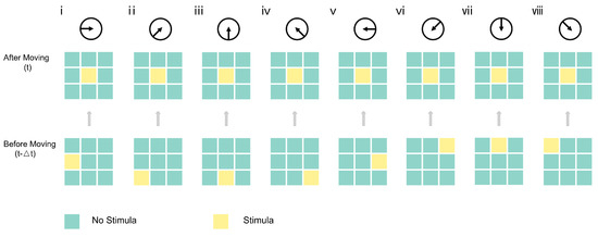 (i) RIGHTWARD neuron (0°) with interaction between R(i, j, t) and R(i − 1, j, t − t), (ii) UPPER RIGHTWARD neuron (45°) with interaction between R(i, j, t) and R(i−1, j−1, t− t), (iii) UPWARD neuron (90°) with interaction between R(i, j, t) and R(i, j+1, t − t), (iv) UPPER LEFTWARD neuron (135°) with interaction between R(i, j, t) and R(i+1, j − 1, t − t), (v) LEFTWARD neuron (180°) with interaction between R(i, j, t) and R(i+1, j, t − t), (vi) LOWER LEFTWARD neuron (−135°) with interaction between R(i, j, t) and R(i+1, j+1, t− t), (vii) DOWNWARD neuron (−90°) with interaction between R(i, j, t) and R(i, j − 1, t − t), (viii) LOWER RIGHTWARD neuron (−45°) with interaction between R(i, j, t) and R(i − 1, j + 1, t − t). Thus, we can detect eight directions of motion. Local motion-sensing direction-selective neurons are summarized in Figure 3. It contains eight basic inhibitory direction-selective neurons.